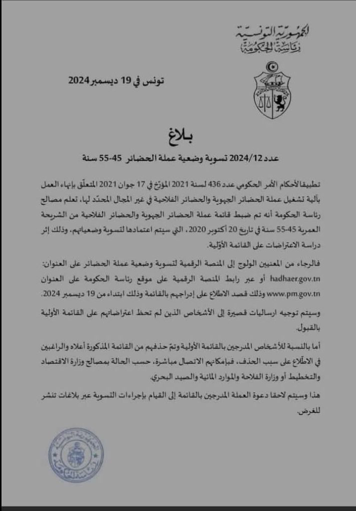 وسيتم لاحقا دعوة العملة المدرجين بالقائمة الى القيام بإجراءات التسوية عبر بلاغات تنشر للغرض وذلك تطبيقا لأحكام الأمر الحكومي المتعلق بإنهاء العمل بالية تشغيل عملة الحضائر الجهوية والفلاحية وفق نص البلاغ.