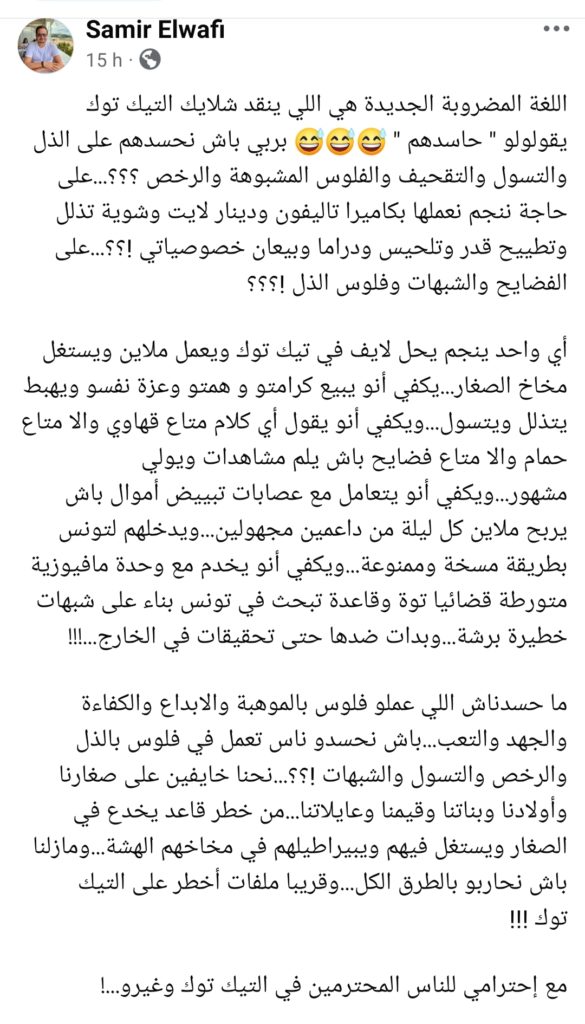 وتابع القول “”ما حسدناش اللي عملو فلوس بالموهبة والابداع والكفاءة والجهد والتعب…باش نحسدو ناس تعمل في فلوس بالذل والرخص والتسول والشبهات !؟؟…نحنا خايفين على صغارنا وأولادنا وبناتنا وقيمنا وعايلاتنا…من خطر قاعد يخدع في الصغار ويستغل فيهم ويبيراطيلهم في مخاخهم الهشة…ومازلنا باش نحاربو بالطرق الكل…وقريبا ملفات أخطر على التيك توك !!!