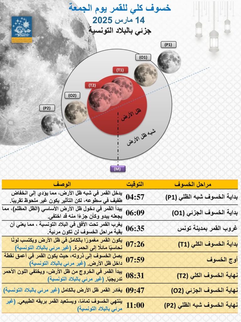 واكد المعهد الوطني للرصد الجوي، انه لن يكون بالإمكان رؤية الخسوف الكلي في البلاد التونسية، ولكن يمكن متابعة المراحل الأولى قبل شروق الشمس.