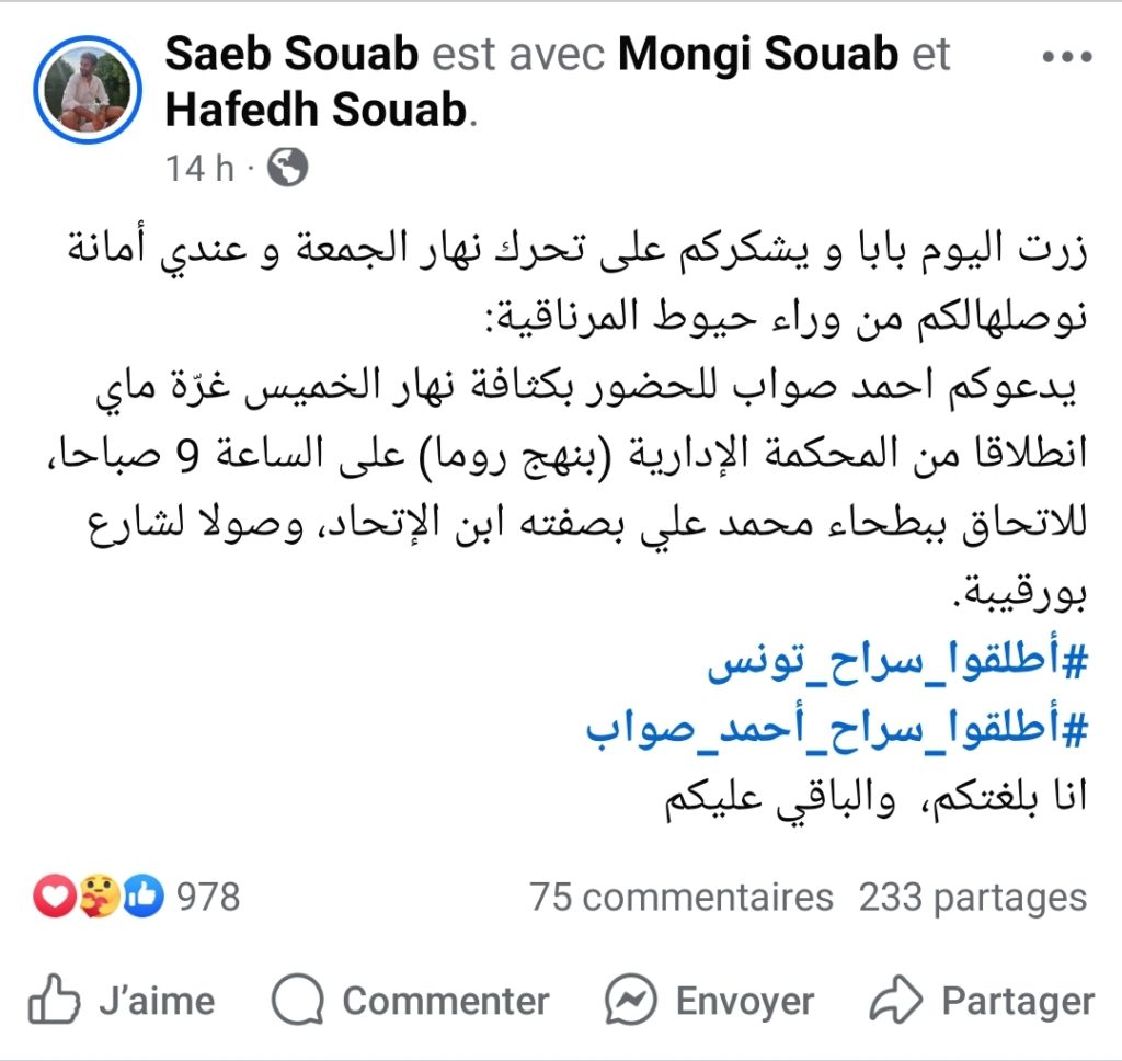 وجه المحامي أحمد الصواب رسالة من سجن المرناقية دعا فيها للمشاركة بكثافة غدا الخميس غرّة ماي انطلاقا من المحكمة الإدارية (بنهج روما) على الساعة 9 صباحا، للاتحاق ببطحاء محمد علي بصفته ابن الإتحاد، وصولا لشارع بورقيبة.