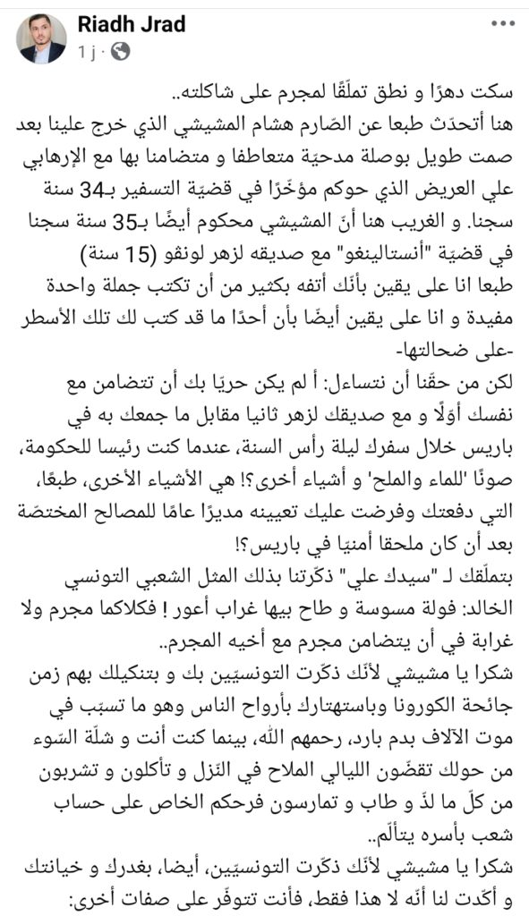 وانتقد رياض جراد في تدوينة نشرها على صفحته الرسمية بالفيسبوك المشيشي موجها له كلمات لاذعة..