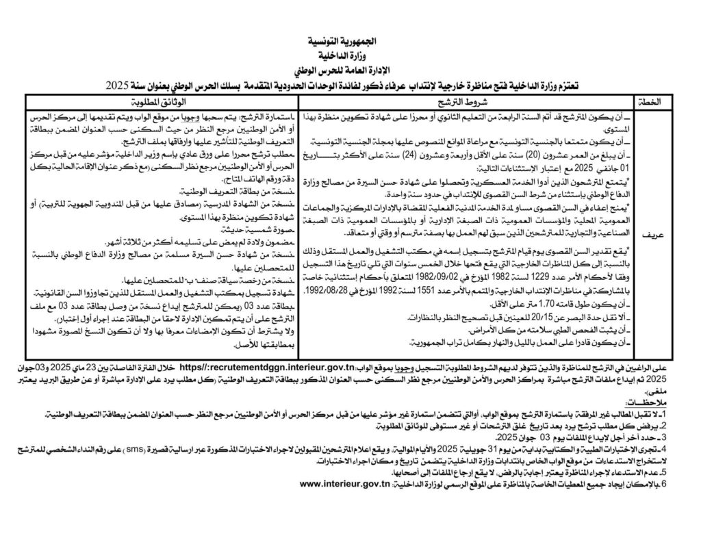 تعتزم وزارة الدّاخليّة فتح مناظرة خارجية لإنتداب عرفاء ذكور لفائدة الوحدات الحدودية المتقدمة بسلك الحرس الوطني لسنة 2025.
