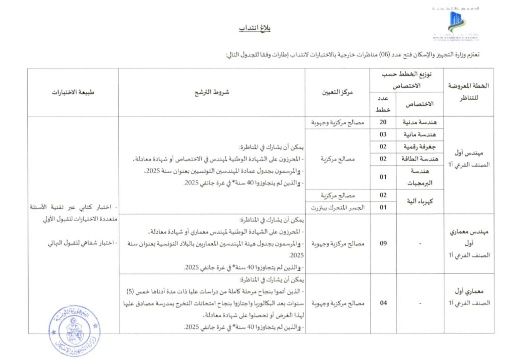 وزارة التجهيز تنتدب.. 2025/05/27 أهم الأخبار, تونس, مجتمع شاركها Facebook Twitter Google + أعلنت وزارة التجهيز والإسكان في بلاغ لها الثلاثاء 27 ماي 2025، عن فتح باب الانتدابات لستة اختصاصات مختلفة وفق الجدول التفصيلي المرفق أدناه: ودعت الوزارة الراغبين في الترشح الاطلاع على الشروط المطلوبة والآجال المحددة للتسجيل. 2025-05-27 samehsassi