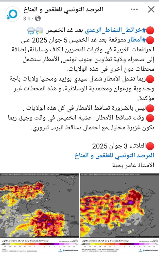 افاد المرصد التونسي للطقس و المناخ انه من المنتظر تسجيل امطار عشية الخميس 5 جوان 2025 بالمرتفعات الغربية في ولايات القصرين الكاف وسليانة، إضافة إلى صحراء ولاية تطاوين جنوب تونس, الأمطار ستشمل محطات دون أخرى في هذه الولايات.