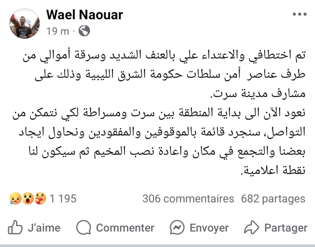 اكد المتحدث باسم قافلة الصمود وائل نوار في تدوينة نشرها منذ قليل على صفحته الرسمية بالفيسبوك أنه تم اختطافه والاعتداء عليه بالعنف الشديد وسرقة أمواله من طرف عناصر أمن سلطات حكومة الشرق الليبية وفق تعبيره.