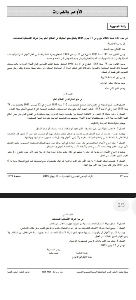 هام/ صدور قانون منع المناولة في القطاع العام وحل شركة الاتصالية للخدمات بالرائد الرسمي..#خبر_عاجل 2025/06/18 أخبار, المصدر, مجتمع شاركها Facebook Twitter Google + صدر بالعدد الاخير للرائد الرسمي للجمهورية التونسية أمر عدد 327 لسنة 2025 مؤرخ في 17 جوان 2025 يتعلق بمنع المناولة في القطاع العام وحل شركة الاتصالية للخدمات . وفي ما يلي التفاصيل: 2025-06-18 hejer krimi