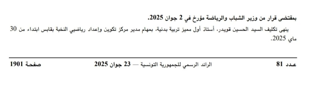 انهاء مهام هذا المسؤول..#خبر_عاجل 2025/06/24 أهم الأخبار, المصدر, مجتمع شاركها Facebook Twitter Google + صدر بالعدد الاخير للرائد الرسمي للجمهورية التونسية بتاريخ 23 جوان 2025 قرار من وزير الشباب والرياضة يقضي بانهاء مهام السيد الحسين قويدر أستاذ أول مميز تربية بدنية من مهام مدير مركز تكوين واعداد رياضي النخبة بقابس ابتداء من 30 ماي 2025. 2025-06-24 hejer krimi