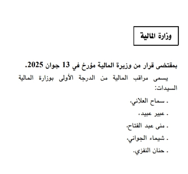 تسميات جديدة بهذه الوزارة..#خبر_عاجل 2025/06/26 أهم الأخبار, المصدر, مجتمع شاركها Facebook Twitter Google + صدر بالعدد الاخير للرائد الرسمي للجمهورية التونسية بتاريخ 24 جوان 2025 قرار من وزيرة المالية مؤرخ في 13 جوان 2025 يقضي بتسمية مراقب المالية من الدرجة الأولى بالوزارة.. 2025-06-26 hejer krimi