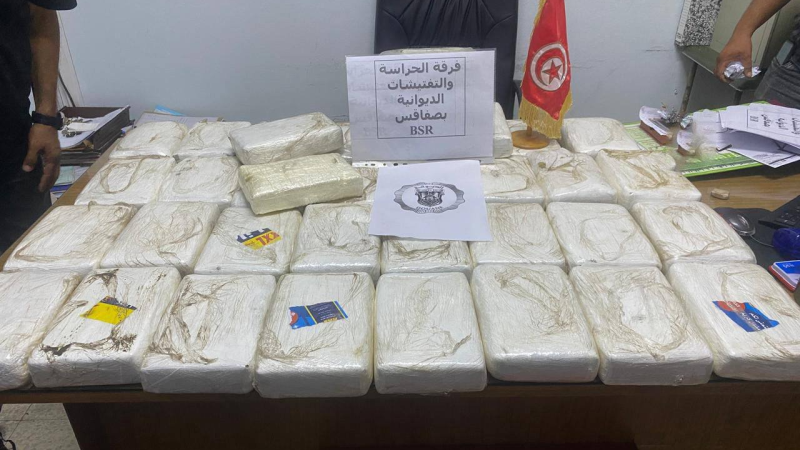 تمكنت فرقة الحرس الديواني بصفاقس بالتنسيق والمساندة من فرقتي الصخيرة والرقاب إثر عمل استعلامي وأثناء القيام بدورية مراقبة وجولان، من ضبط كمية هامة من مخدر الكوكايين قدرت بـ 39 صفيحة تزن 42929 غراما باعتبار اللف ( تقدر قيمتها بما يفوق 12.8 مليون دينار ) مخفية بإحكام على متن شاحنة على مستوى الطريق السريعة بالصخيرة.