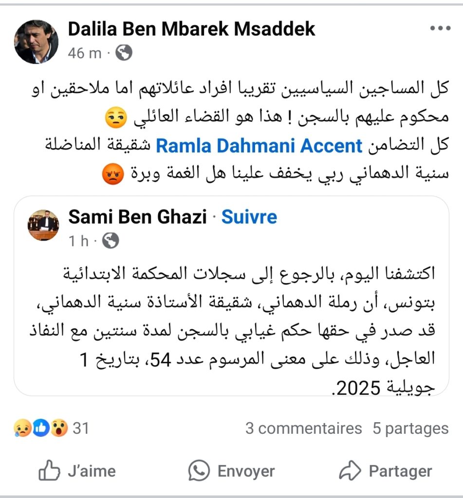 وقالت دليلة مصدق في تدوينة نشرتها على صفحتها الرسمية بالفيسبوك “” كل المساجين السياسيين تقريبا افراد عائلاتهم اما ملاحقين او محكوم عليهم بالسجن ! هذا هو القضاء العائلي 😒