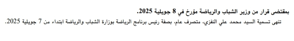 صدر بالعدد الأخير للرائد الرسمي للجمهورية التونسية بتاريخ اليوم الثلاثاء 15 جويلية 2025 قرار من وزير الشباب والرياضة مؤرخ في 8 جويلية 2025 يقضي بانهاء تسمية محمد علي النفزي متصرف عام بصفة رئيس برنامج الرياضة بوزارة الشباب والرياضة ابتداء من 7 جويلية 2025.