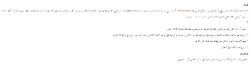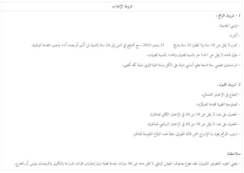 فتحت وزارة الدفاع الوطني بداية من يوم 14 جويلية 2025، باب التسجيل للترشح لمناظرة انتداب إنتداب جنود متطوعين لفائدتها (جيش الطيران والمصالح المشتركة والمصالح الفنية والهياكل المركزية الراجعة بالنظر إلى الوزارة)