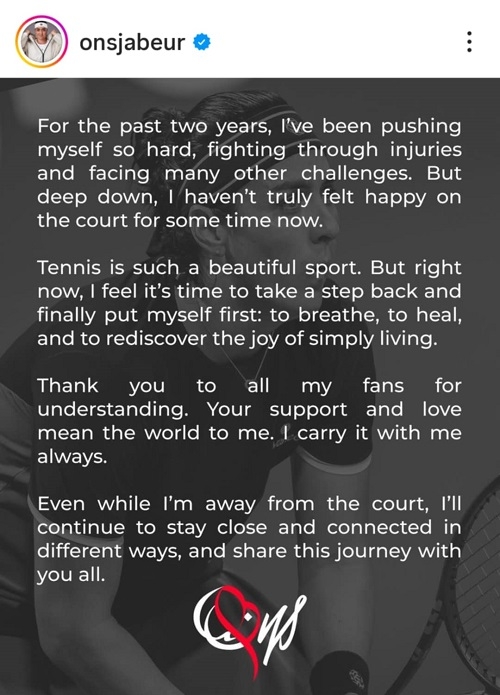 وكتبت جابر على حسابها الرسمي على إنستغرام: “خلال السنتين الأخيرتين، بذلت مجهودًا كبيرًا، وعانيت من الإصابات وتحديات أخرى عديدة.. لكن في أعماقي، لم أشعر بالسعادة الحقيقية على الملعب منذ فترة طويلة.. التنس رياضة رائعة، لكن اليوم، أعتقد أن الوقت قد حان لأخذ خطوة للوراء ومنح الأولوية لنفسي أخيرًا: لأتنفس، لأتعافى، ولأعيد اكتشاف متعة الحياة ببساطة..”
