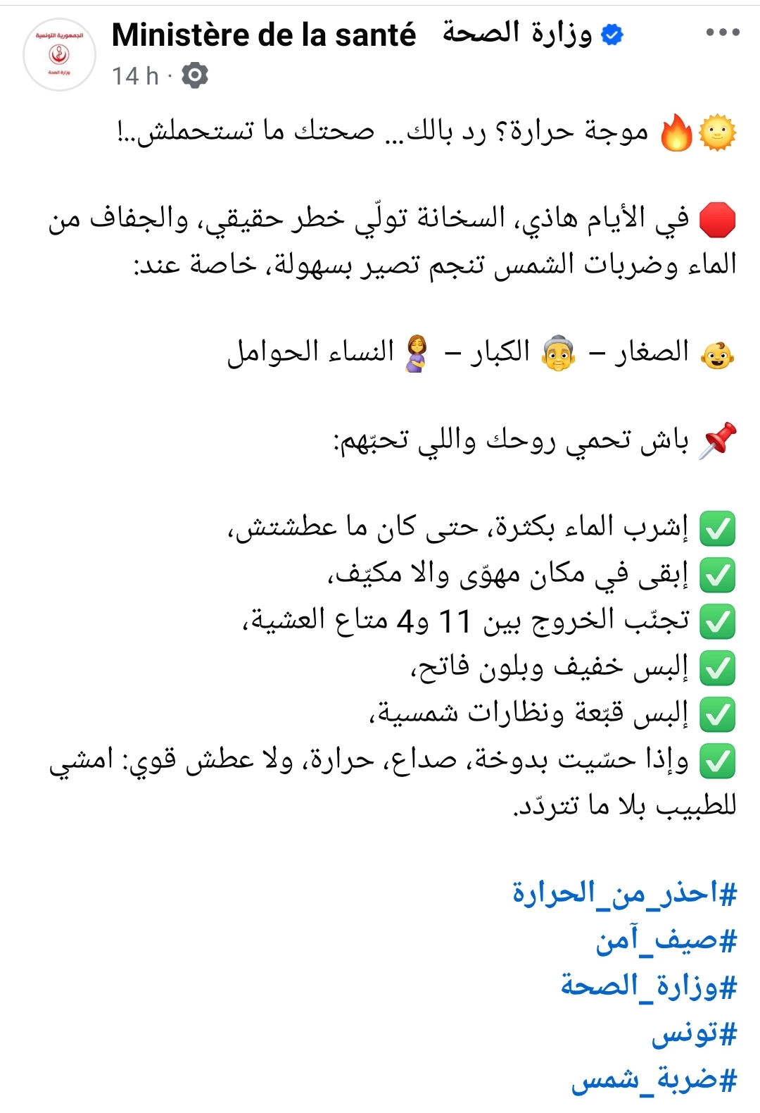 عاجل/ تزامنا مع موجة الحر: وزارة الصحة تحذر وتنصح.. 2025/07/21 أهم الأخبار, المصدر, مجتمع شاركها Facebook Twitter Google + تزامنا مع موجة الحر التي تشهدها تونس هذه الأيام حذرت وزارة الصحة المواطنين إلى الانتباه واخذ الاحتياطات اللازمة لتجنب ضربة الشمس والجفاف خاصة عند الأطفال والنساء الحوامل وكبار السن. وفي ما يلي النصائح التي قدمتها الوزارة: 2025-07-21 hejer krimi