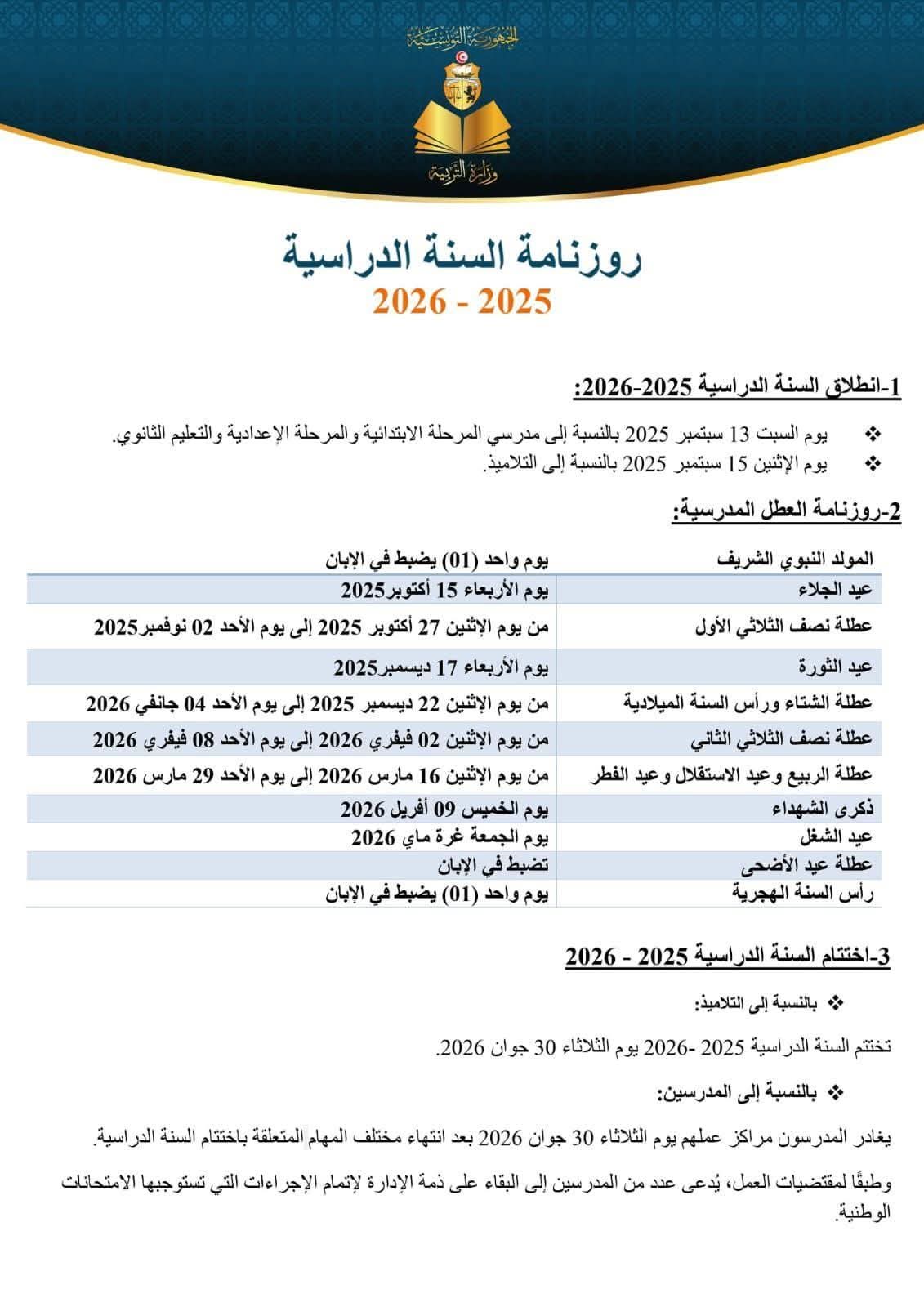 عاجل/ وزارة التربية تنشر رزنامة السنة الدراسية 2025-2026.. 2025/07/22 أهم الأخبار, المصدر, مجتمع شاركها Facebook Twitter Google + نشرت وزارة التربية في بلاغ لها رزنامة السنة الدراسية 2025 – 2026 وفي ما يلي التفاصيل.. 2025-07-22 hejer krimi