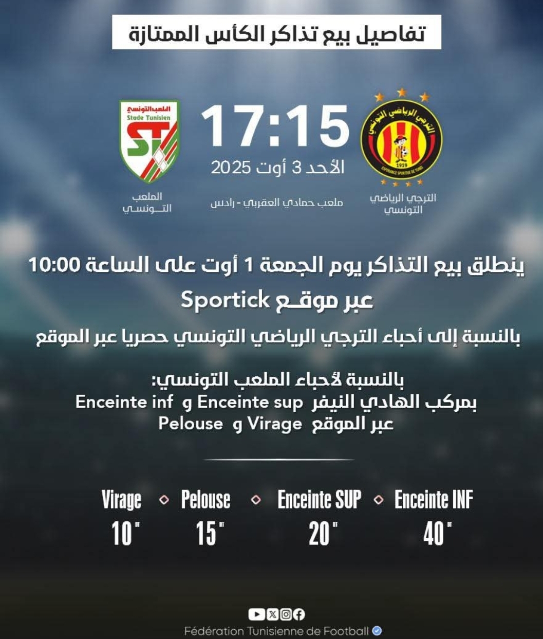تعلم الجامعة التونسية لكرة القدم أنّ بيع التذاكر ينطلق يوم الجمعة على الساعة 10 صباحا
