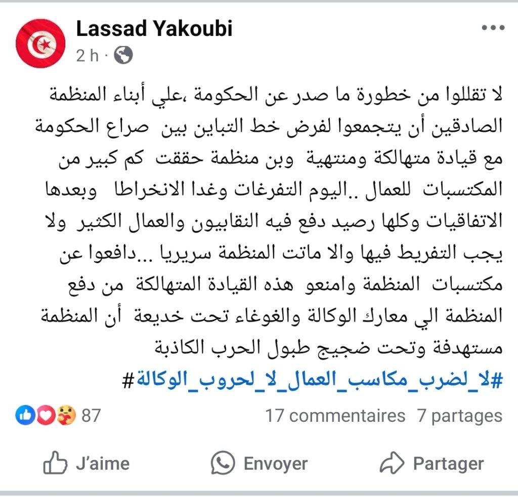 كما دعا اليعقوبي في تدوينة نشرها على صفحته الرسمية بالفيسبوك أبناء الاتحاد الذين وصفهم بالصادقين إلى “الدفاع عن مكتسبات المنظمة الشغيلة ومنع القيادة التي نعتها بالمتهالكة من دفع المنظمة الي معارك الوكالة والغوغاء تحت خديعة أن المنظمة مستهدفة وتحت ضجيج طبول الحرب الكاذبة”.