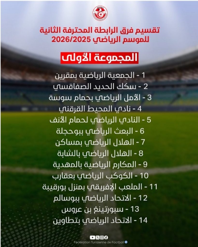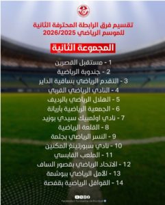 أعلنت الجامعة التونسية لكرة القدم أنّها اعتمدت مبدأ الترتيب الفردي والزوجي لتقسيم فرق الرابطة المحترفة الثانية إلى مجموعتين خلال موسم 2025 – 2026.