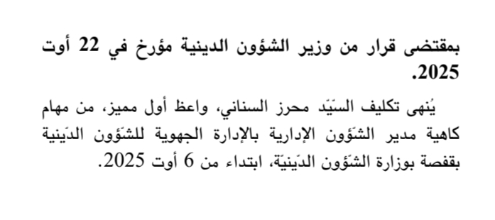 انهاء مهام هذا المسؤول..#خبر_عاجل 2025/08/30 أهم الأخبار, المصدر, مجتمع شاركها Facebook Twitter Google + تم بمقتضى قرار صادر عن وزير الشؤون الدينية نشر بالعدد الاخير للرائد الرسمي للجمهورية التونسية بتاريخ 29 أوت 2025 إنهاء مهام هذا المسؤول.. 2025-08-30 hejer krimi