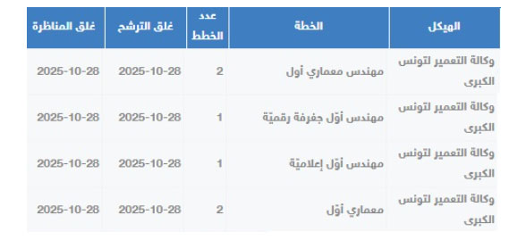 تعتزم وكالة التعمير لتونس الكبرى التابعة لوزارة التجهيز والاسكان فتح 04 مناظرات خارجية بالاختبارات لانتداب اطارات وفقا للجدول التالي: