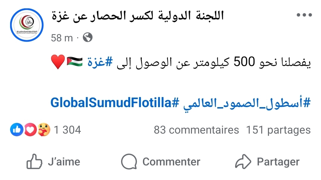 عاجل/ أسطول الصمود يقترب من غزة..وهذه المسافة المتبقية للوصول.. 2025/09/29 أهم الأخبار, المصدر, مجتمع شاركها Facebook Twitter Google + أعلنت اللجنة الدولية لكسر الحصار عن غزة مساء اليوم الاثنين انه لم يعد يفصل سفن أسطول الصمود سوى نحو 500 كيلومتر للوصول إلى #غزة. 2025-09-29 hejer krimi