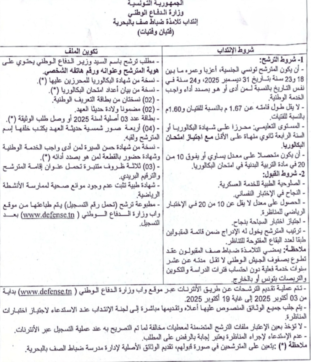 وتتم عملية تقديم الترشحات عن طريق موقع واب الوزارة www.defence.tn انطلاقا من اليوم وإلى غاية 19 أكتوبر2025.