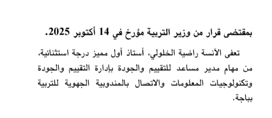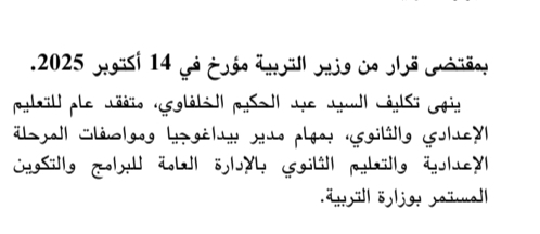 عاجل/ اعفاءات بوزارة التربية.. 2025/10/16 أهم الأخبار, المصدر, مجتمع شاركها Facebook Twitter Google + صدر بالعدد الاخير للرائد الرسمي للجمهورية التونسية بتاريخ 14 أكتوبر 2025 قرار من وزير التربية يقضي بانهاء مهام هاذين المسؤولين.. 2025-10-16 hejer krimi