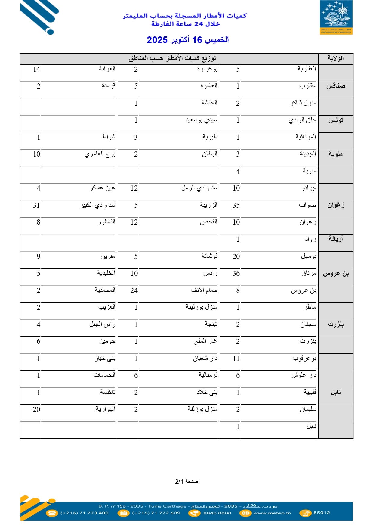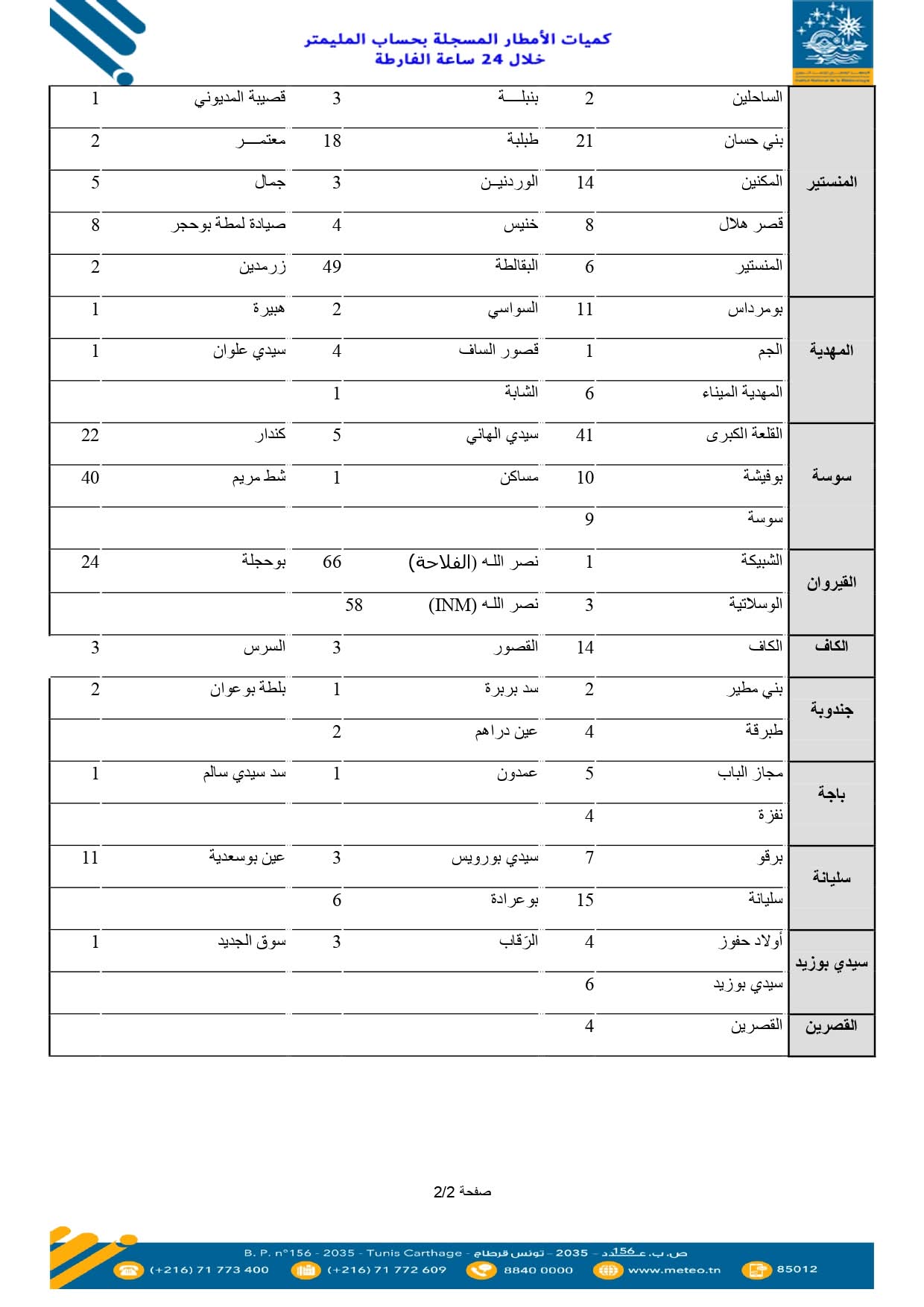 وفي ما يلي قائمة مفصلة بكميات الأمطار نقلا عن المعهد الوطني للرصد الجوي: