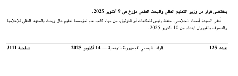 عاجل/ انهاء مهام هذه المسؤولة.. 2025/10/16 أهم الأخبار, المصدر, مجتمع شاركها Facebook Twitter Google + صدر بالعدد الاخير للرائد الرسمي للجمهورية التونسية بتاريخ 14 أكتوبر 2025 قرار من وزير التعليم العالي يقضي بأعضاء هذه المسؤولة من مهامها. وفي ما يلي التفاصيل: 2025-10-16 hejer krimi
