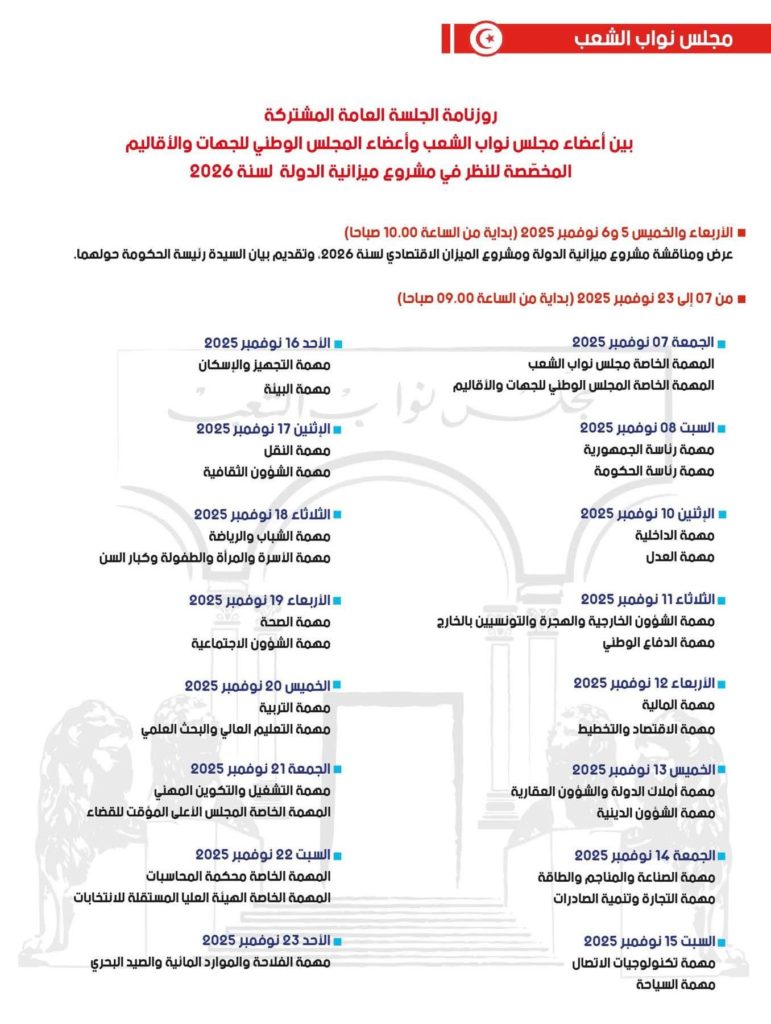 يشرع مجلس نواب الشعب بداية من يوم الأربعاء 5 نوفمبر 2025 على الساعة العاشرة صباحا في عقد الجلسات العامة المشتركة مع المجلس الوطني للجهات والأقاليم، المخصّصة للنظر في مشروع ميزانية الدولة لسنة 2026.