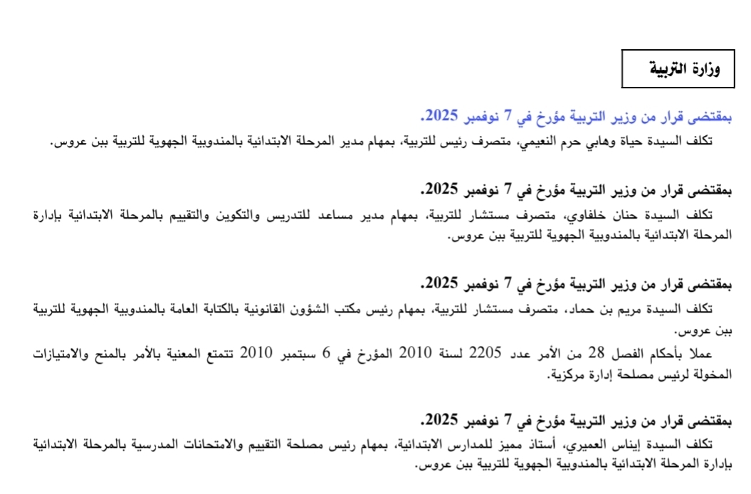 صدر بالعدد الاخير للرائد الرسمي للجمهورية التونسية قرار من وزير التربية تضمن تسميات جديدة لمسؤولين صلب الوزارة..