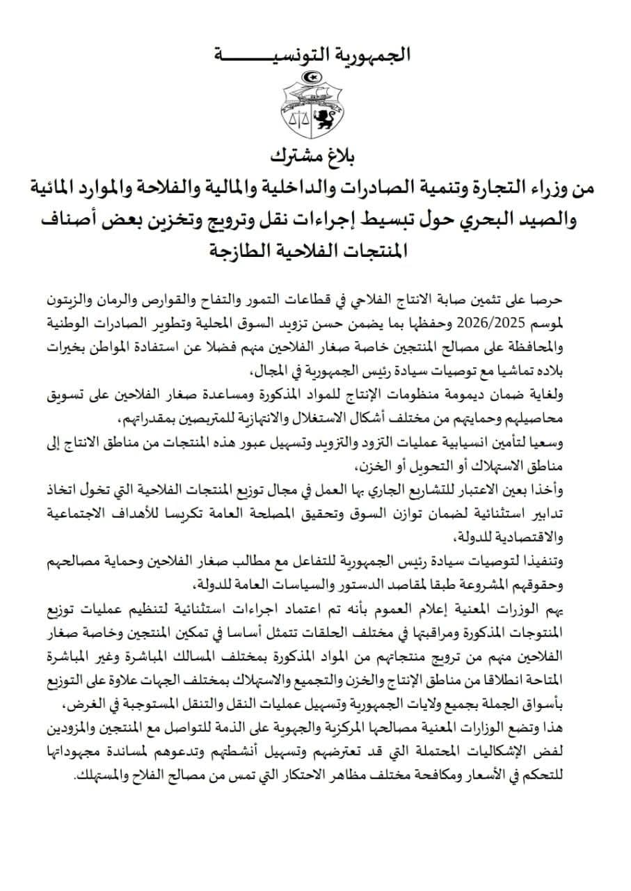 أصدرت كل من وزارات التجارة وتنمية الصادرات والداخلية والمالية والفلاحة والموارد المائية والصيد البحري بلاغا مشتركا مساء امس حول تبسيط إجراءات نقل وترويج وتخزين بعض أصناف المنتجات الفلاحية الطازجة للموسم 2025/2026، خصوصاً فيما يهم منتجات مثل التفاح والتمور والرمان والزيتون والقوارص.