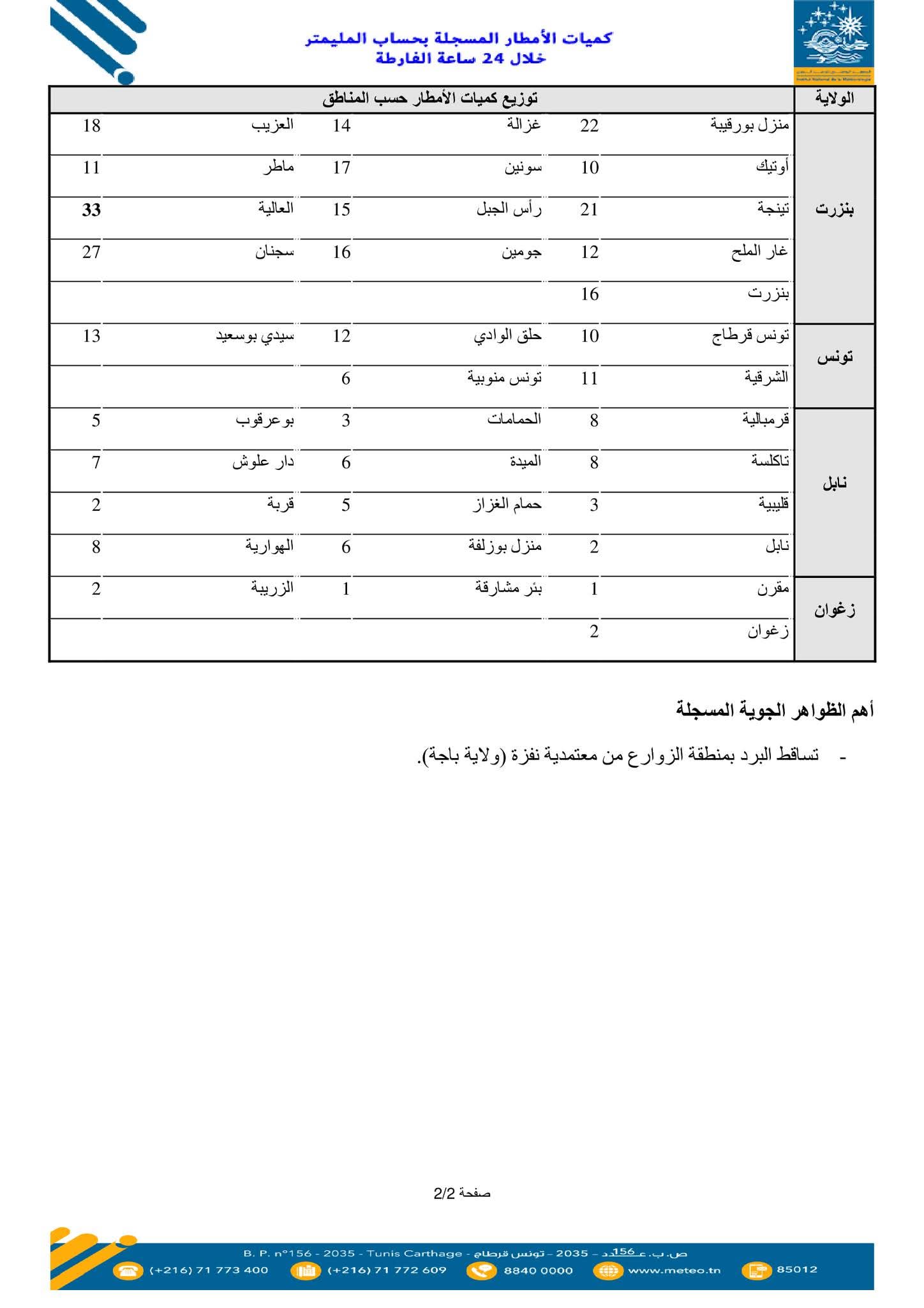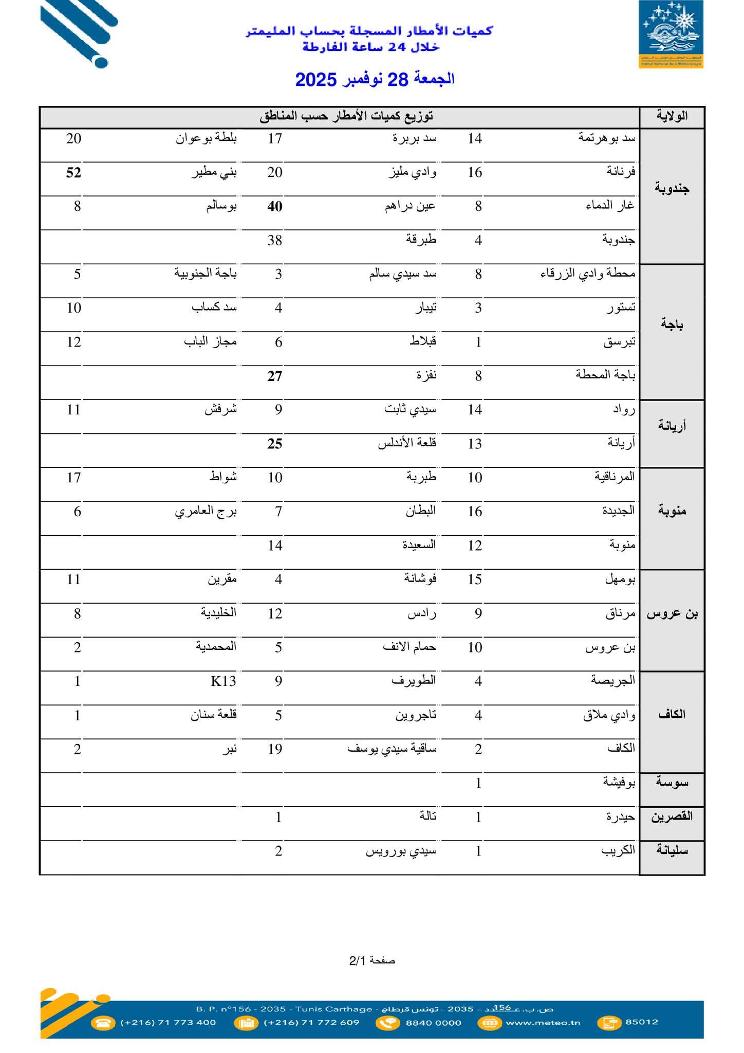 بالارقام..قائمة بكميات الامطار المسجلة خلال 24 ساعة الماضية..#خبر_عاجل 2025/11/28 أهم الأخبار, المصدر, متفرقات شاركها Facebook Twitter Google + نشر المعهد الوطني للرصد الجوي قائمة لكميات الأمطار المسجلة بحساب المليمتر خلال الـ 24 ساعة الفارطة من الساعة 07 صباحا ليوم الخميس 27 نوفمبر إلى الساعة 07 صباحا ليوم الجمعة 28 نوفمبر 2025 : 2025-11-28 hejer krimi