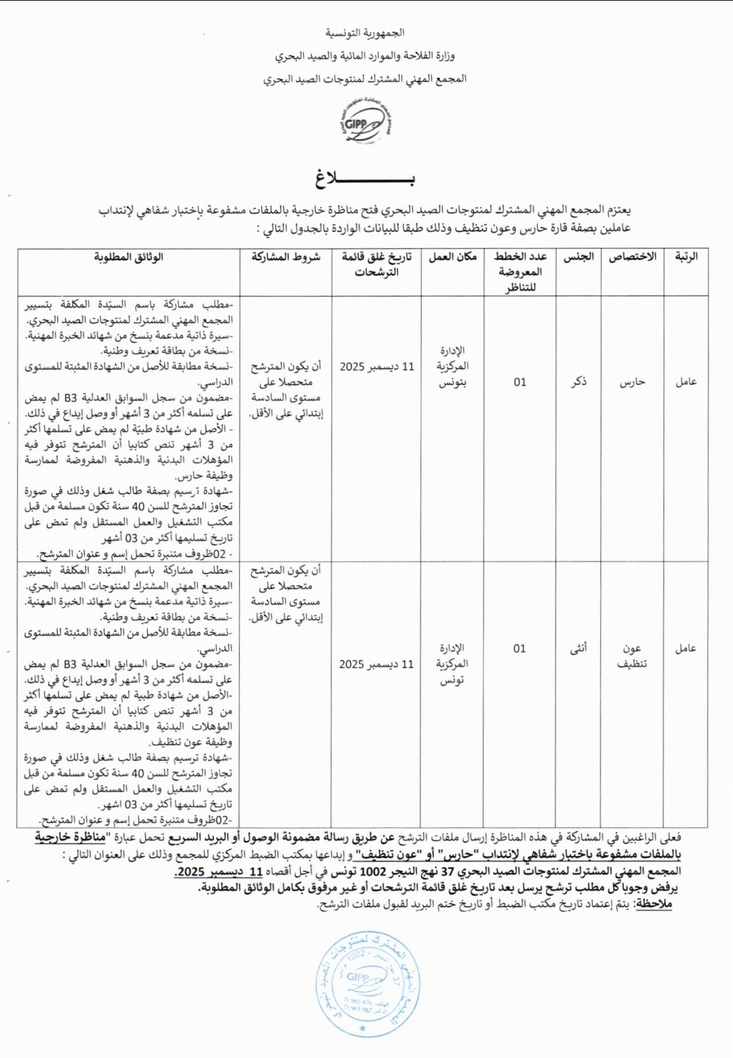 المجمع المهني المشترك لمنتوجات الصيد البحري ينتدب.. 2025/11/28 أهم الأخبار, المصدر, انتدابات شاركها Facebook Twitter Google + يعتزم المجمع المهني المشترك لمنتوجات الصيد البحري فتح مناظرة خارجية لانتداب عاملين بصفة قارة :حارس و عون تنظيف . وفي ما يلي التفاصيل.. 2025-11-28 hejer krimi