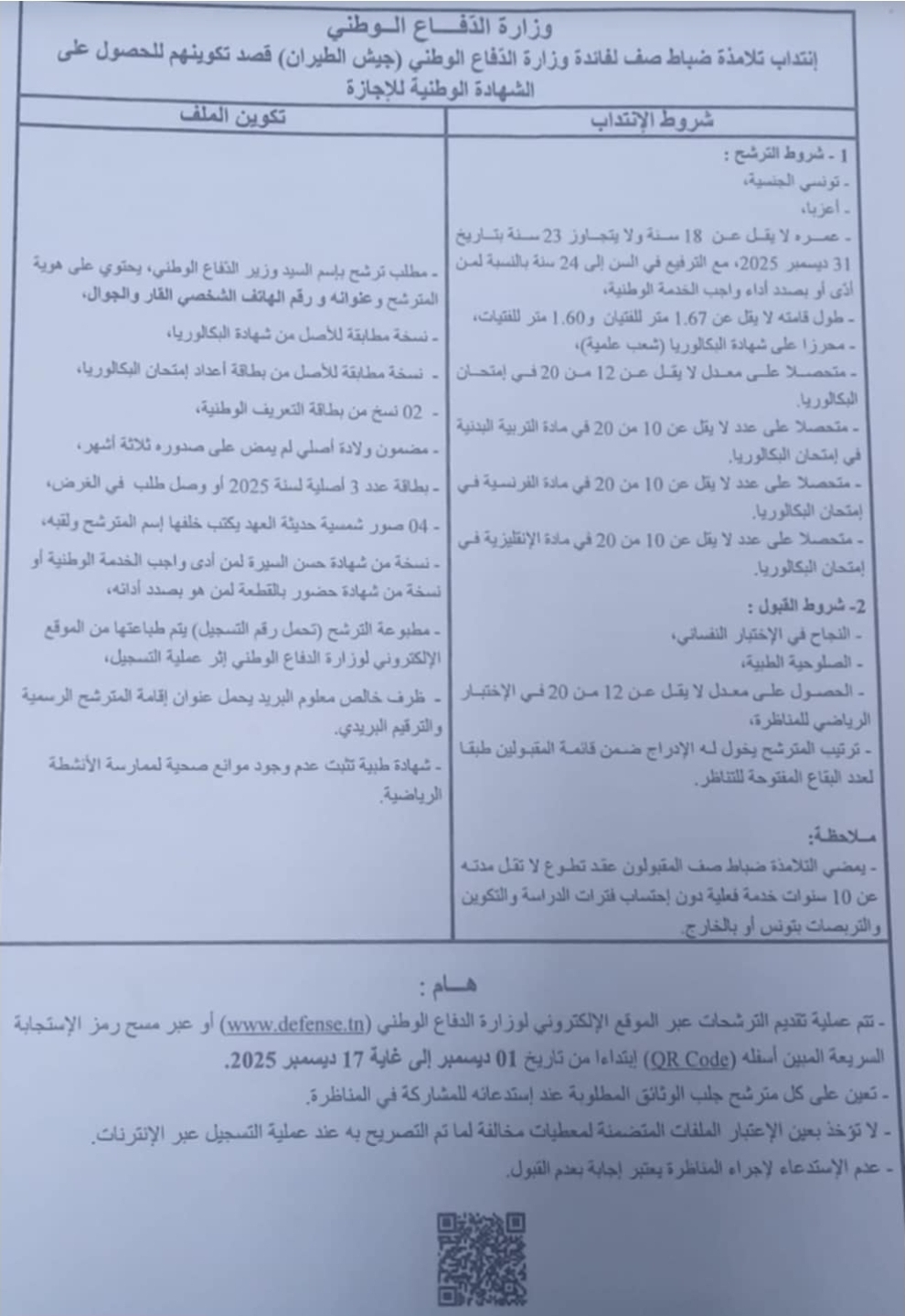 ويكون التسجيل عبر الموقع الإلكتروني للوزارة www.defense.tn أو عبر مسح رمز الاستجابة السريعة QR Code، وذلك غلى غاية 17 ديسمبر.