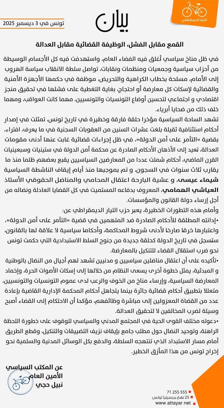 وأكد التيار الديمقراطي في بيان صادر عنه اليوم الثلاثاء 03 ديسمبر 2025 أن توظيف الأجهزة الأمنية والقضائية، وآخرها إصدار أحكام استئنافية ثقيلة في قضية “التآمر على أمن الدولة” واعتقال الناشطة شيماء عيسى والمحامي العياشي الهمامي، يمثل خرقاً صارخاً للعدالة وضرباً لاستقلال القضاء يهدف إلى إسكات المعارضة والتغطية على الفشل الاقتصادي والاجتماعي.