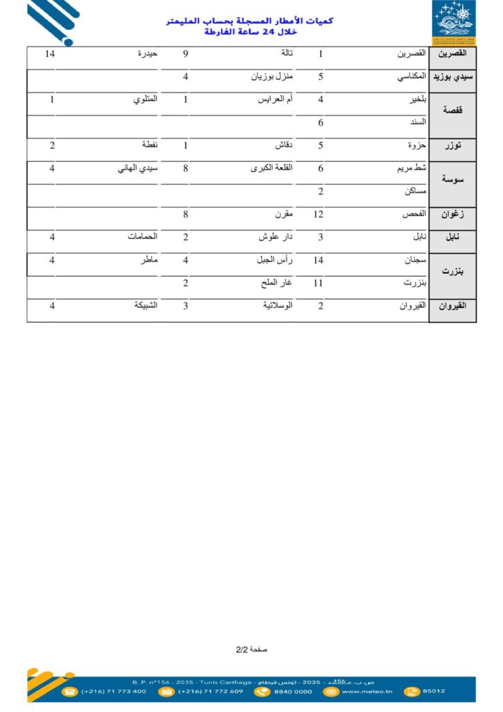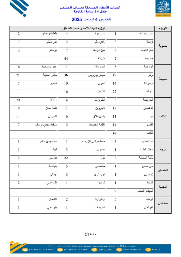 سجلت العديد من جهات الجمهورية خلال الـ24 ساعة الماضية نزول كميات من الأمطار، بلغ أقصاها في مدينة الكاف بـ48 مم.