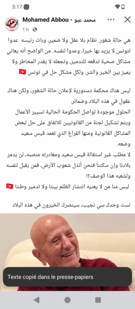 واعتبر محمد عبو ان تونس حاليا في “حالة شغور”.. حيث يحكمها “نظام بلا عقل ولا ضمير، وبات رئيسه عدوا لتونس لا يريد بها خيرا، وعدوا لنفسه”، مضيفا ان رئيس الدولة “من الواضح أنه يعاني مشاكل صحية تدفعه للتدمير، وتجعله لا يقدر المخاطر ولا يميز بين الخير والشر”، حسب نص التدوينة.