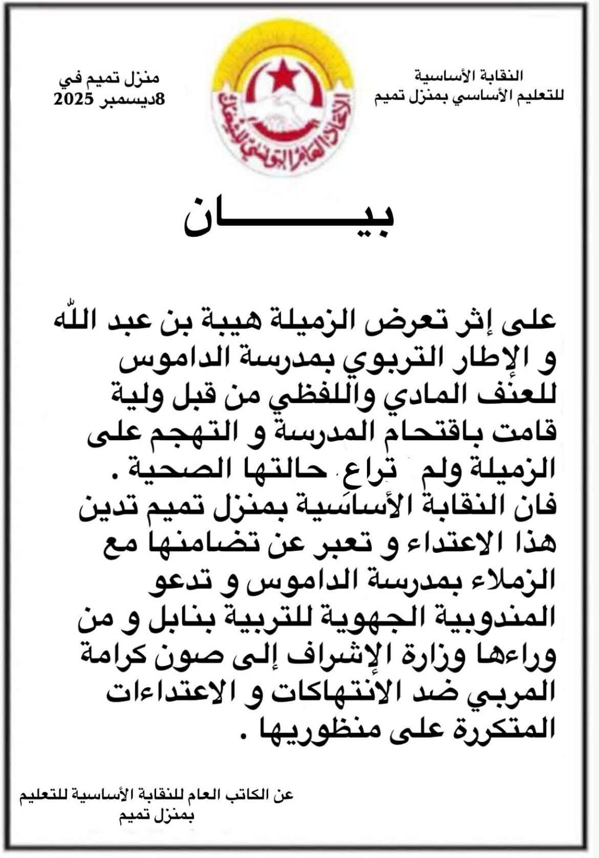 وأدانت النقابة الاساسية للتعليم الاساسي بمنزل تميم في بيان لها هذا الاعتداء على زميلتهم، وعبرت عن تضامنها مع كافة المربين بالمدرسة المذكورة ودعت المندوبية الجهوية للتربية بنابل ووزارة الاشراف الى صون كرامة المربين ضد الانتهاكات والاعتداءات المتكررة على منظوريها.