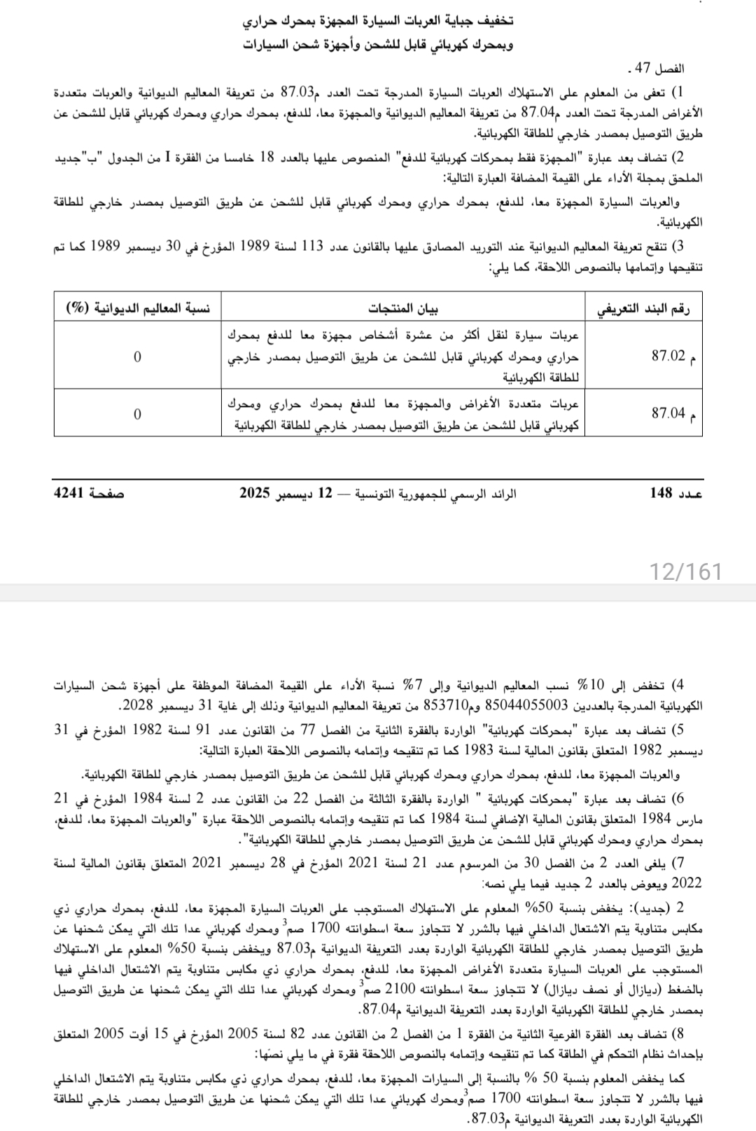 صدر بالعدد الاخير للرائد الرسمي للجمهورية التونسية قانون المالية لسنة 2026 وينص الفصل 47 منه على تخفيف المعاليم الديوانية الموظفة على أنواع معينة من السيارات، خاصة تلك التي تعمل بمحركات حرارية أو كهربائية قابلة للشحن، وذلك لتشجيع الانتقال الطاقي.