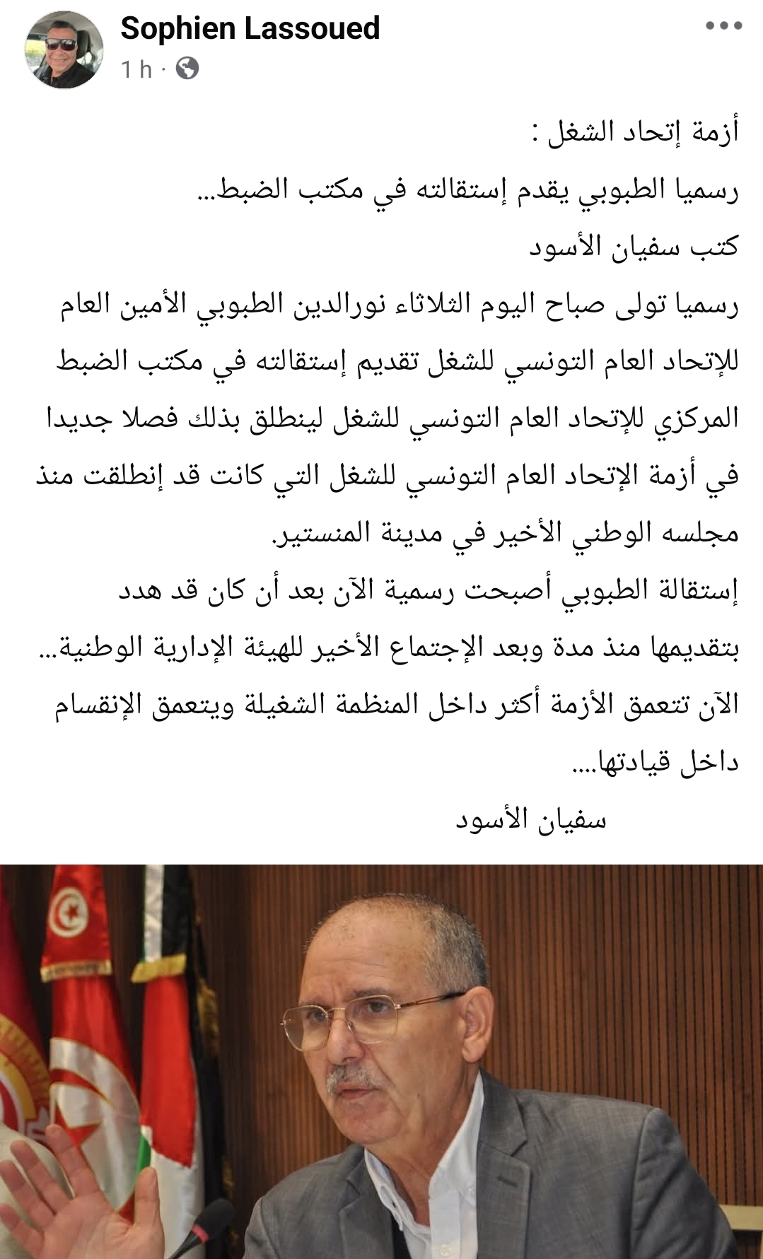 أكد الصحفي المختص في الشؤون النقابية سفيان الأسود تقديم الأمين العام لاتحاد الشغل، نور الدين الطبوبي، استقالته رسمياً من منصبه.