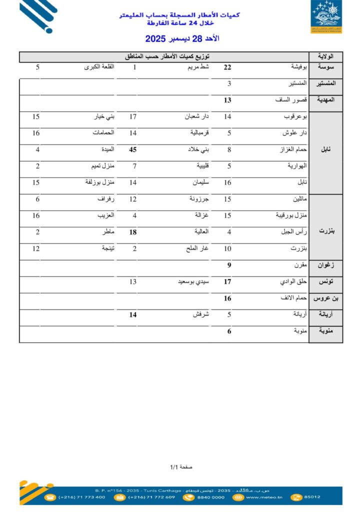 وسُجّلت أعلى كمية ببني خلاد من ولاية نابل بـ45 مم، تليها بوفيشة من ولاية سوسة بـ22 مم، ثم العالية من ولاية بنزرت بـ18 مم وحلق الوادب بـ17 ملم.