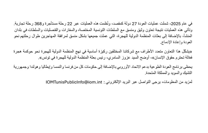 وعلى الصعيد اللوجستي، نُظمت عمليات العودة نحو 27 دولة مقصد عبر 22 رحلة مستأجرة و368 رحلة تجارية، وذلك بفضل تنسيق وثيق مع السلطات التونسية والبعثات الدبلوماسية والقنصلية. وأكد السيد عزوز السامري، رئيس بعثة المنظمة في تونس، أن هذا التعاون متعدد الأطراف يعد ركيزة أساسية لحوكمة هجرة فعالة تحترم حقوق الإنسان. وتجدر الإشارة إلى أن هذا البرنامج يحظى بدعم مالي من الاتحاد الأوروبي وحكومات عدة دول من بينها فرنسا، وإيطاليا، والنمسا، والمملكة المتحدة.
