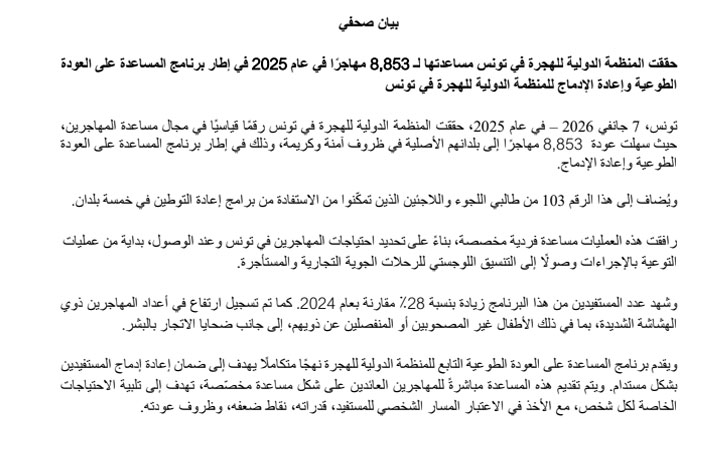 حققت المنظمة الدولية للهجرة في تونس رقماً قياسياً خلال عام 2025 بمساعدة 8,853 مهاجراً على العودة الطوعية إلى بلدانهم الأصلية في ظروف آمنة وكريمة، وهو ما يمثل زيادة بنسبة 28% مقارنة بعام 2024.