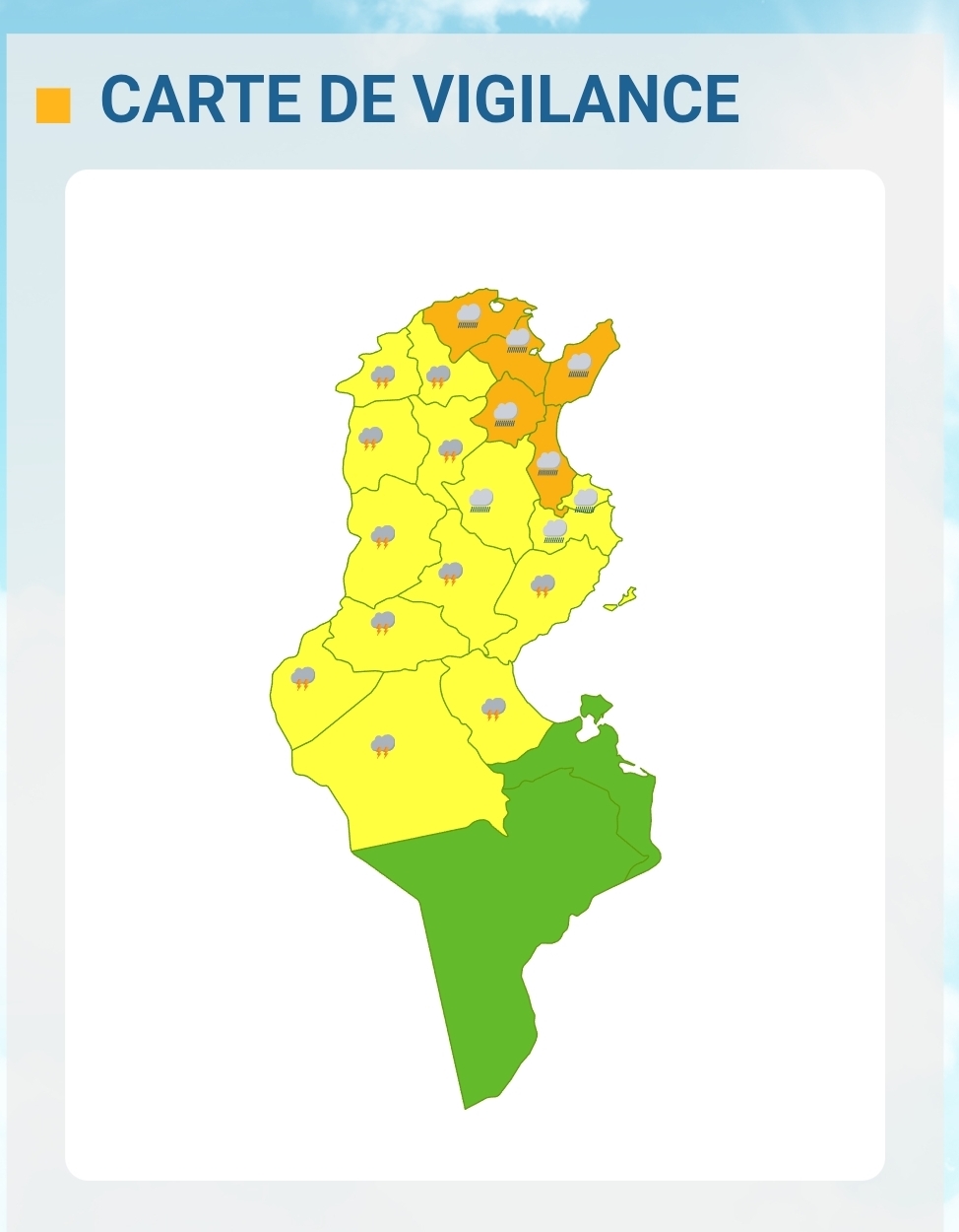 وقد نشر المعهد الوطني للرصد الجوّي خارطة اليقظة، داعيا سكان ولايات تونس الكبرى وسوسة وزغوان ونابل وبنزرت إلى توخّي أعلى درجات الحذر.