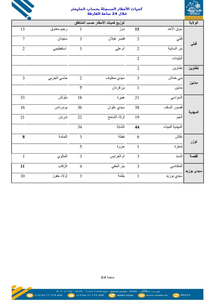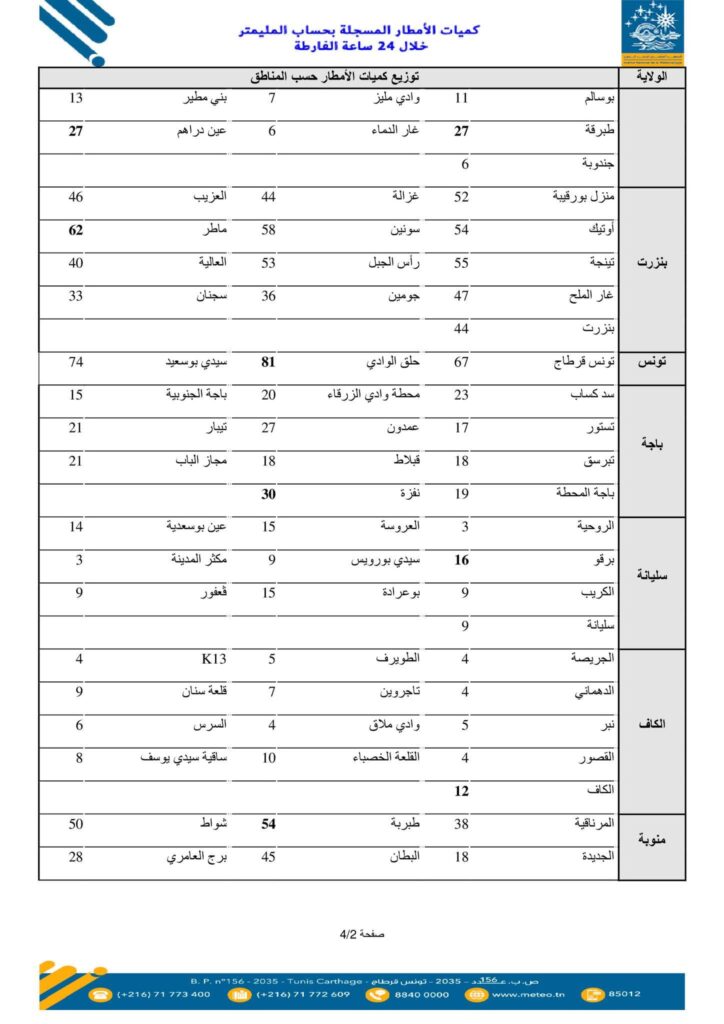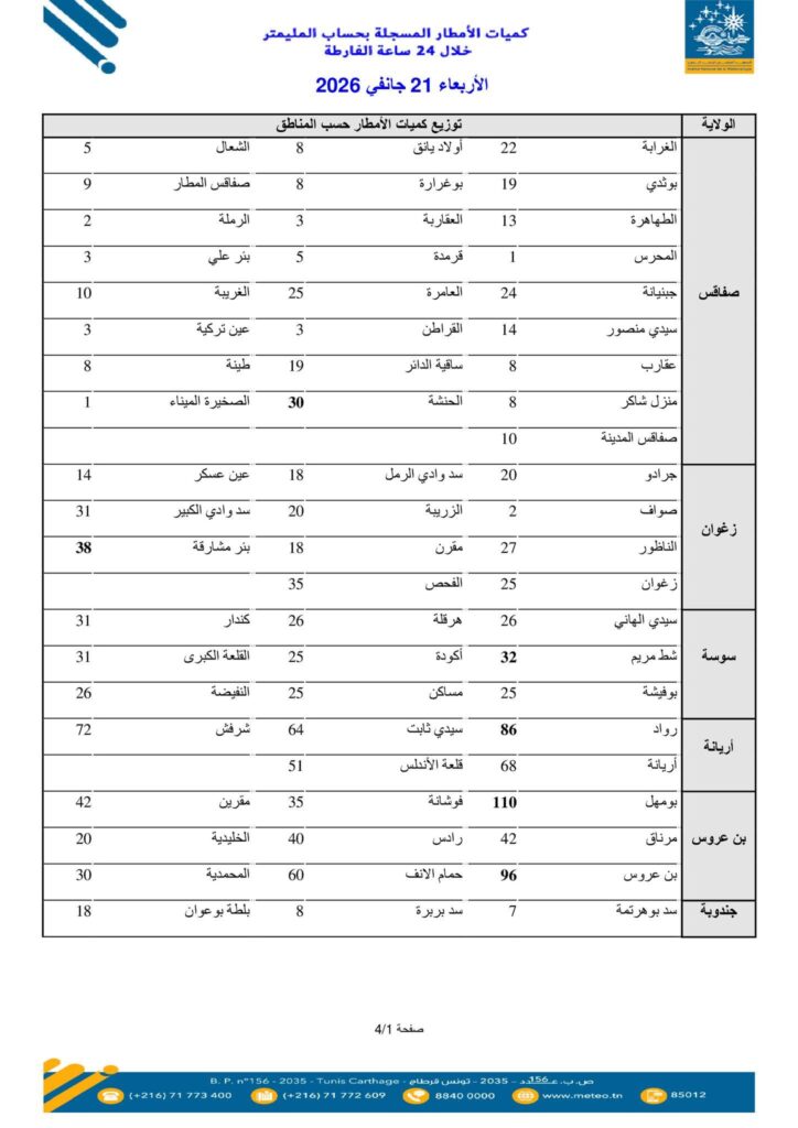 سجّلت مختلف ولايات الجمهورية، من يوم الثلاثاء 20 جانفي بداية من الساعة السابعة صباحا إلى يوم الأربعاء 21 جانفي 2026 على الساعة السابعة صباحا، نزول كميات كبيرة من الأمطار.