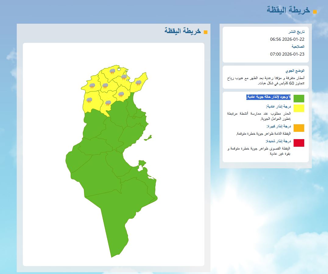 أظهرت آخر تحديثات “خريطة اليقظة” الصادرة عن المعهد الوطني للرصد الجوي صباح اليوم الخميس 22 جانفي 2026، استمرار التقلبات الجوية في عدة مناطق تونسية، حيث تم وضع ولايات الشمال والوسط الشرقي تحت مستوى “الإنذار الأصفر”.