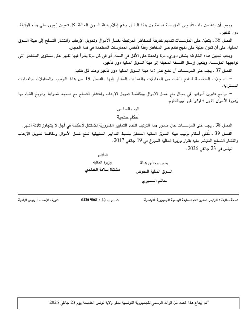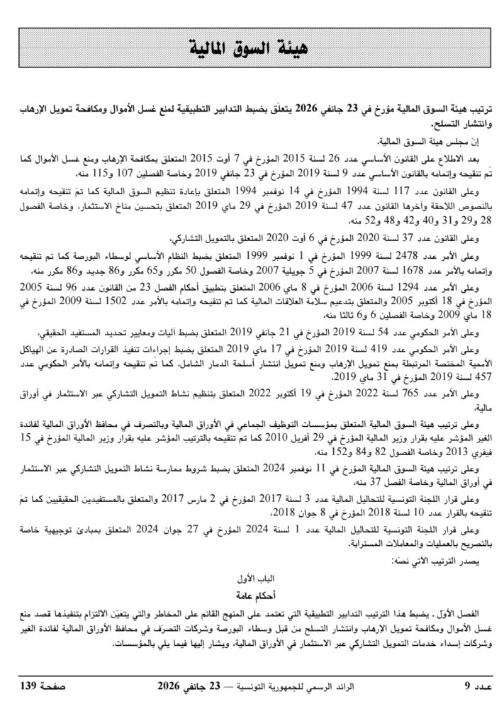 أصدرت هيئة السوق المالية ترتيبا جديدا يتعلق بضبط التدابير التطبيقية لمكافحة غسل الاموال وتمويل الارهاب وانتشار التسلح.