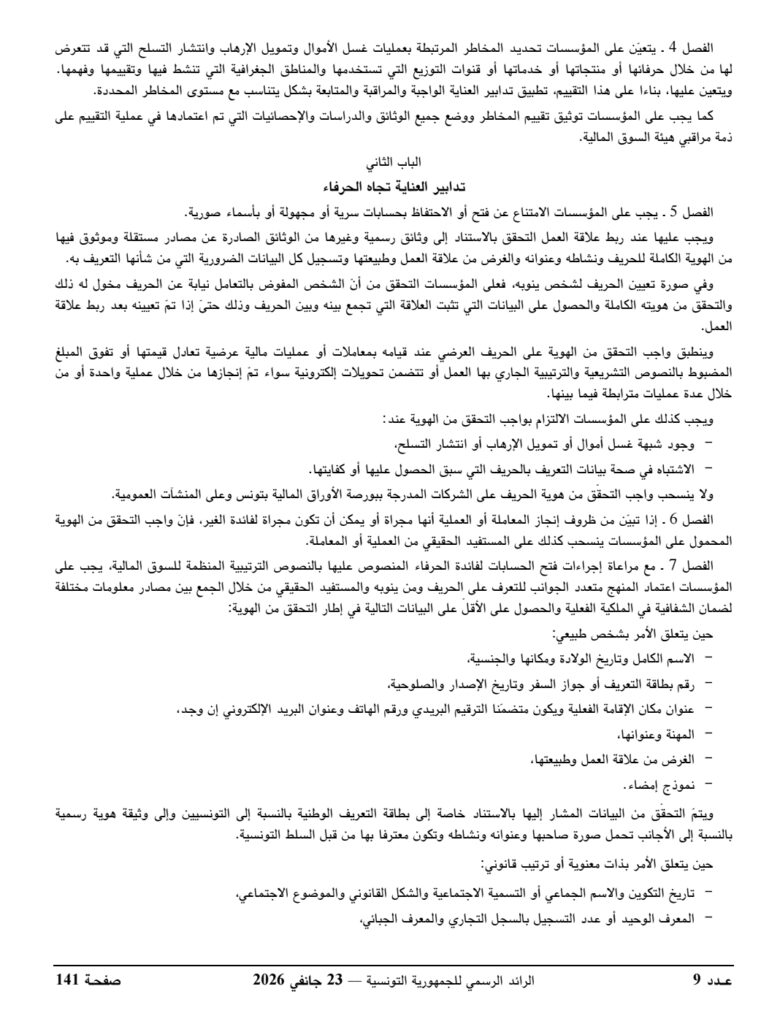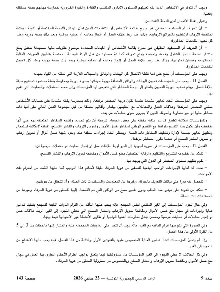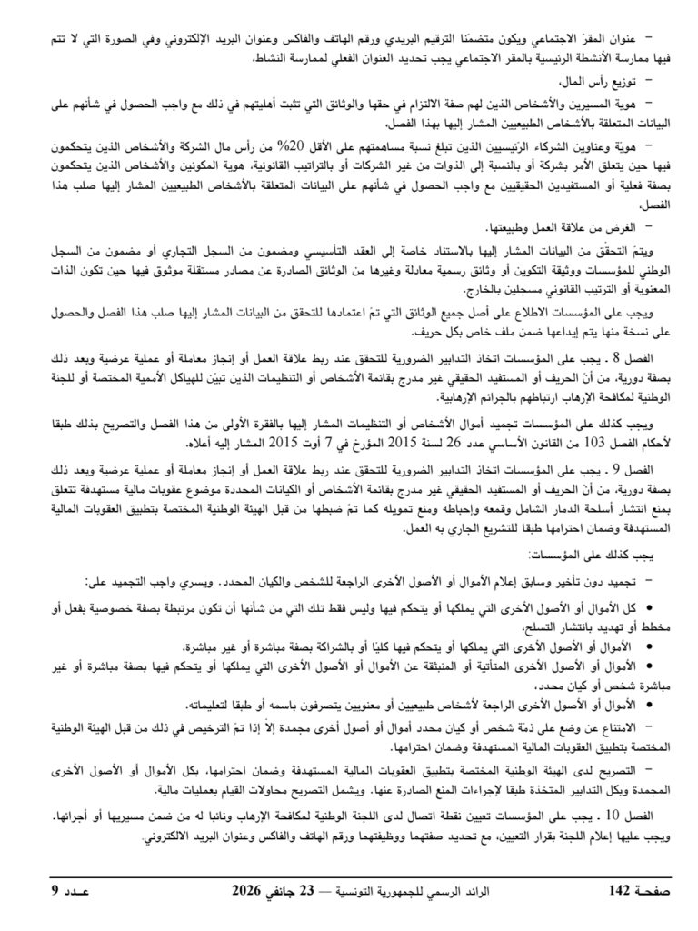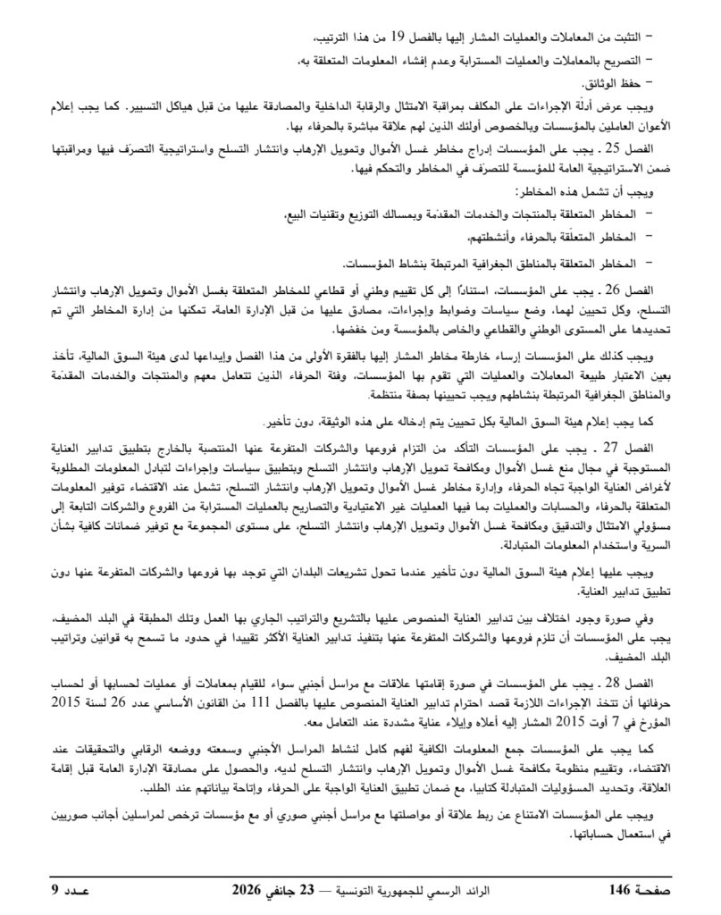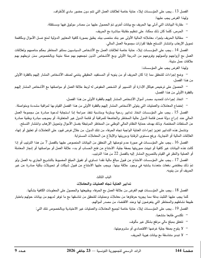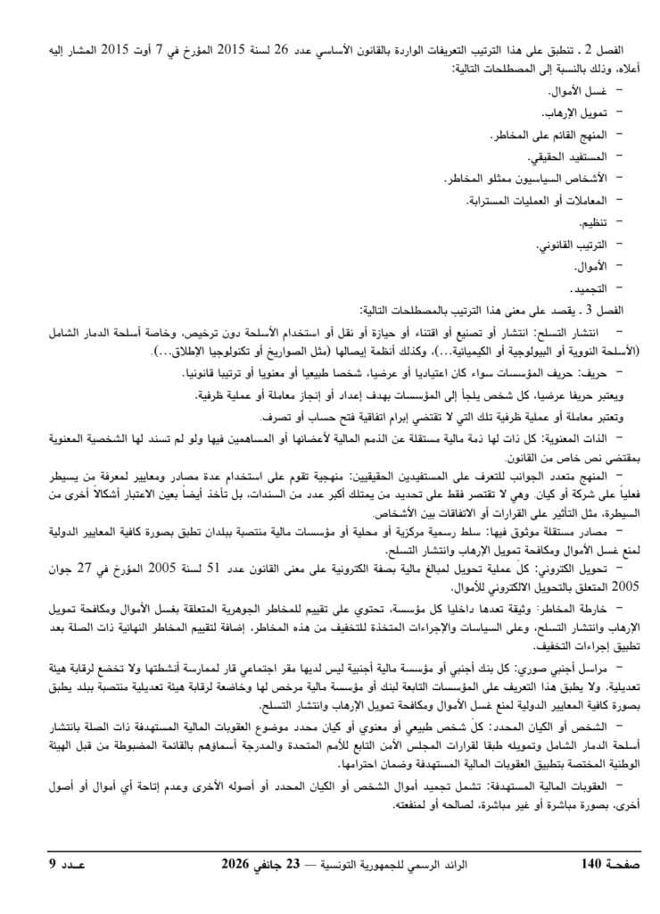 وتم اعداد الترتيب الجديد الصادر بالرائد الرسمي للجمهورية التونسية بتاريخ 23 جانفي 2026، على ضوء التنقيحات الجوهرية، التي ادخلت على القانون الاساسي عدد 26 المؤرخ في 7 أوت 2015، والمتعلق بمكافحة إلارهاب ومنع غسل الأموال.