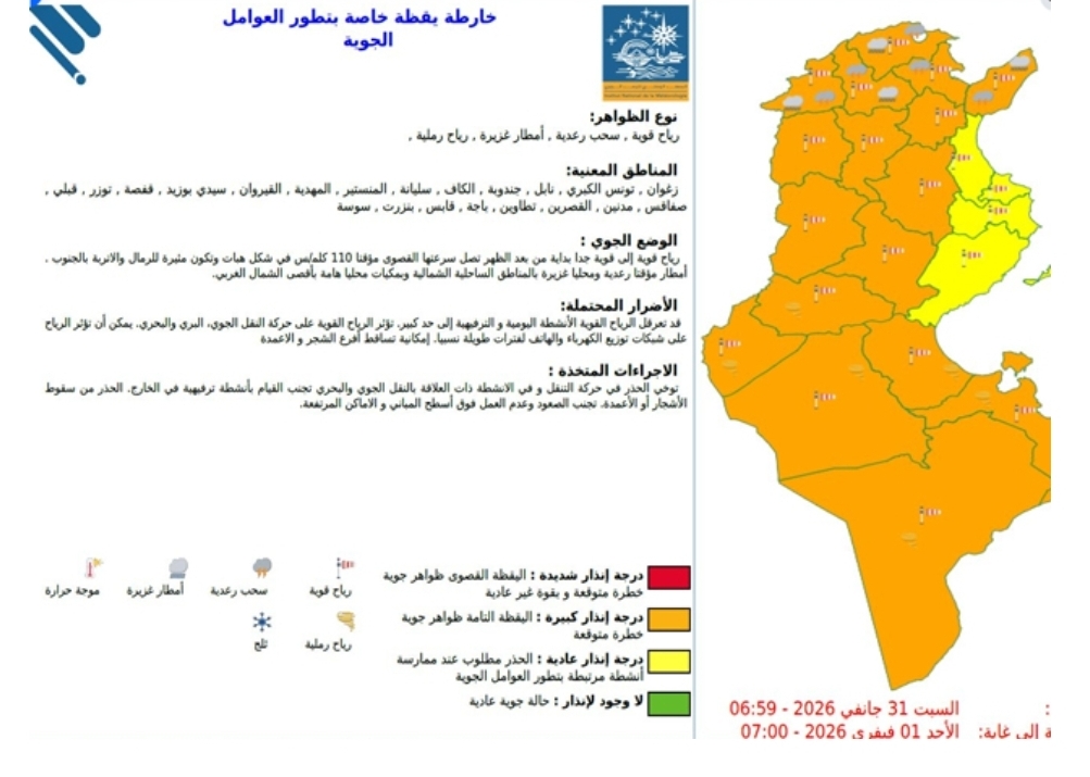 توقّع المعهد الوطني للرصد الجوي هبوب رياح قوية إلى قوية جدا بداية من بعد ظهر اليوم تصل سرعتها القصوى مؤقتا 110 كلم/س في شكل هبات وتكون مثيرة للرمال والاتربة بالجنوب.